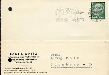 x16261; NS-Zeit: Werde Mitglied der NS-Volkswohlfahrt. Magdeburg 28.10.37. Mi516.auf Firmenkarte Last und Opitz (gelocht).