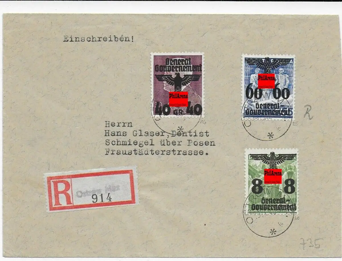 GG: portogerechtes Einschreiben Doppelbrief Ostrow Maz. nach Schmiegel 1940