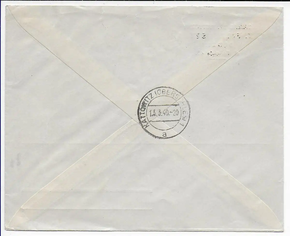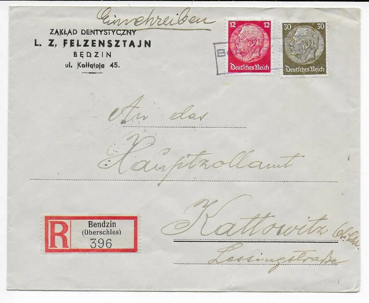 DR: Brief von Bedzin als Einschreiben nach Kattowitz 1940