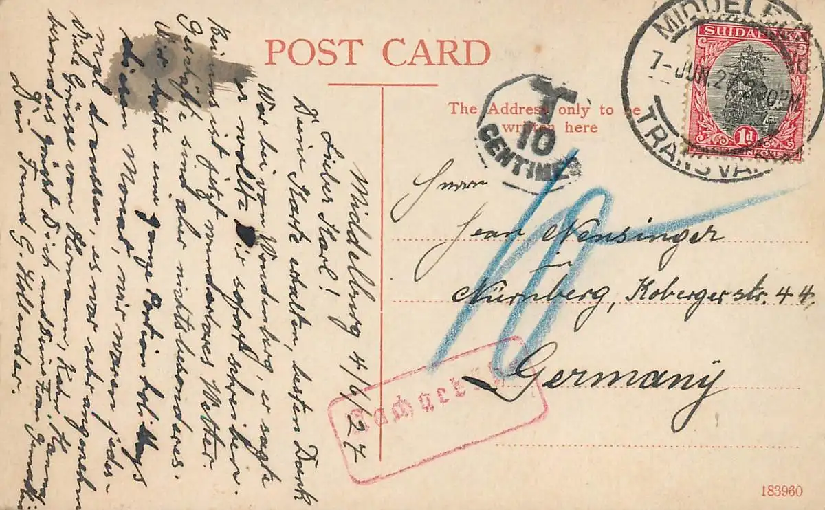 Südafrika: Middle Falls, Transvaal 1927 nach Nürnberg und zurück, Taxe