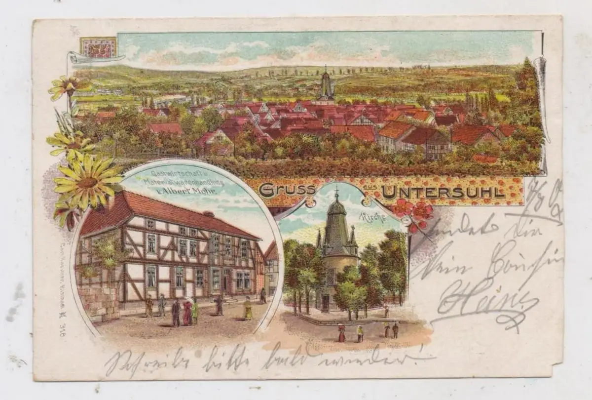 0 - 5904 GERSTUNGEN - UNTERSUHL, Lithographie, Gastwirtschaft Mohr, Kirche, Gesamtansicht, Eckfehler