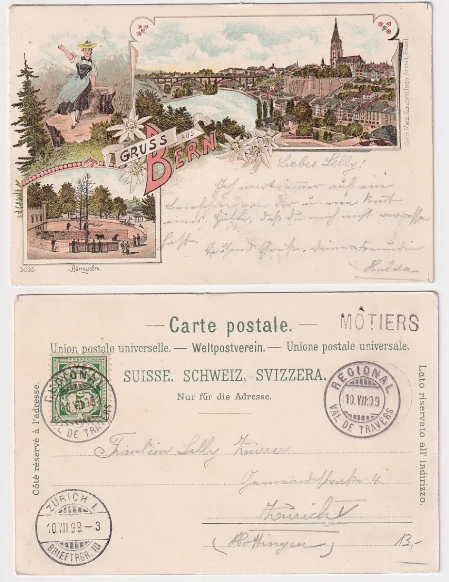 09186 Ak Lithografie Gruss aus Bern Schweiz 1899 mit Stationsstempel Môtiers