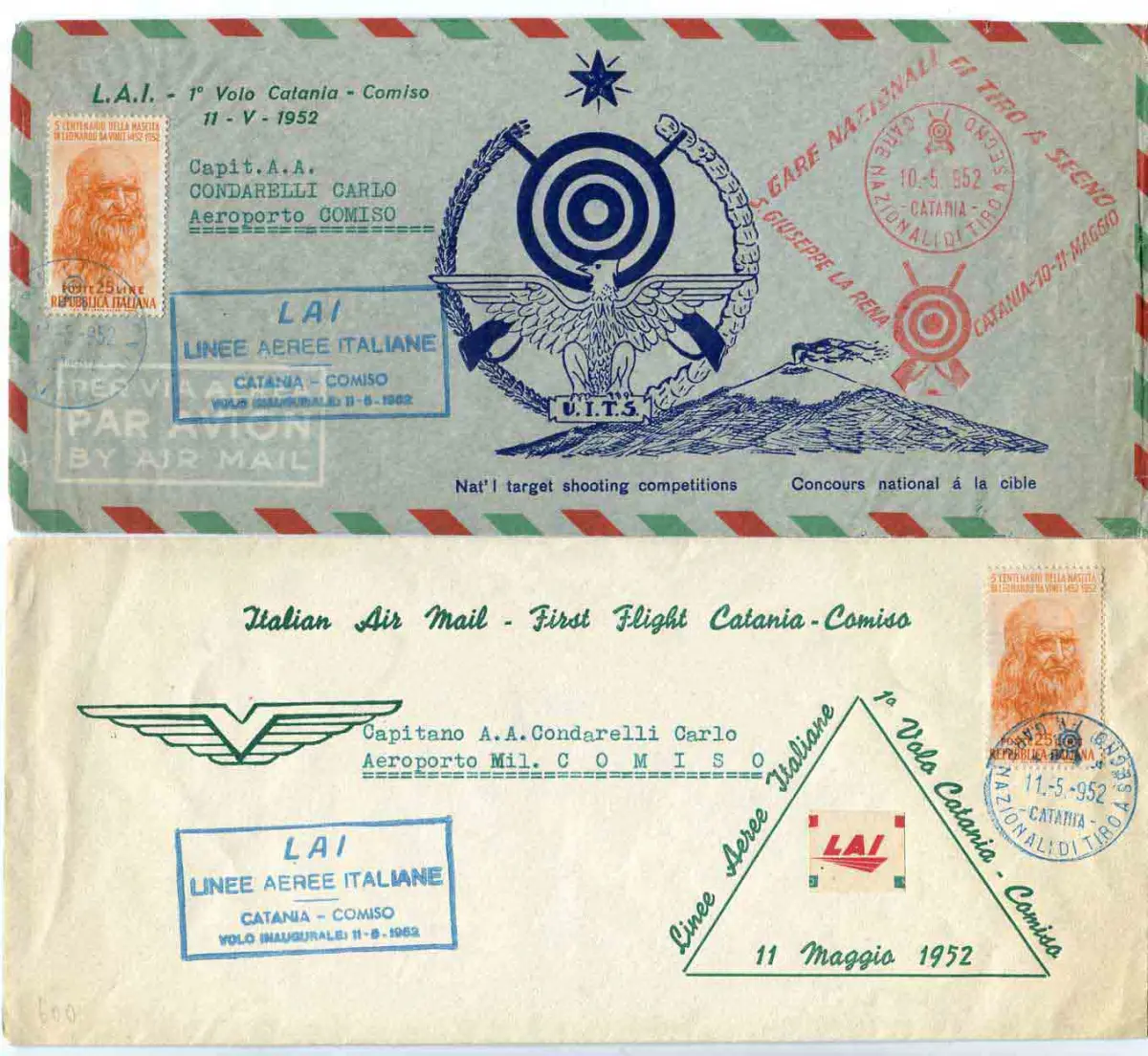 1. Flug LAI Catania / Comiso BUSTA - LAI Catania / Comiso - Zwei Aerogramme mit Ann. spezielle in blauer Mappe, eine mit Ann. As. Naz. Schießrennen in rot und einer mit der gleichen Ann. in hellblau (Kat. Pellegrini Nr. 197BC) - Schön und ungewöhnlich - Bewertung 250/300 Nr. 445/6