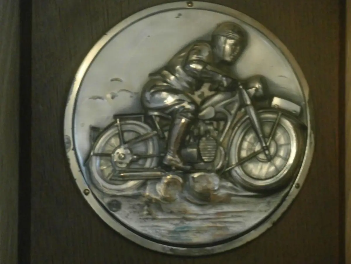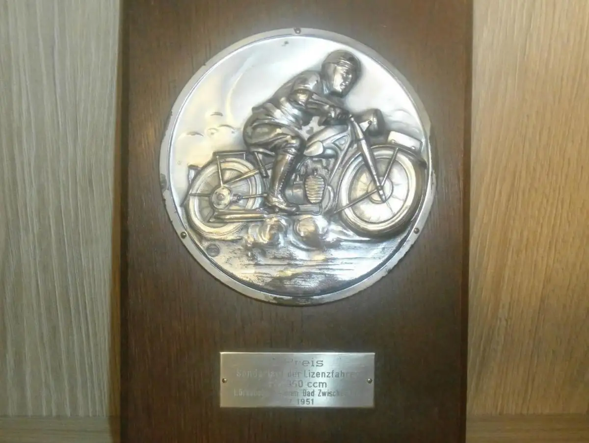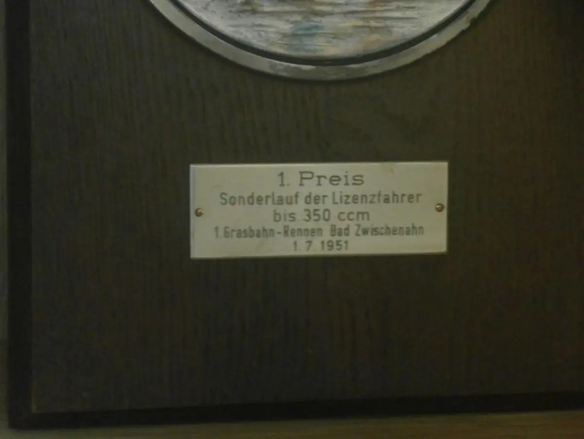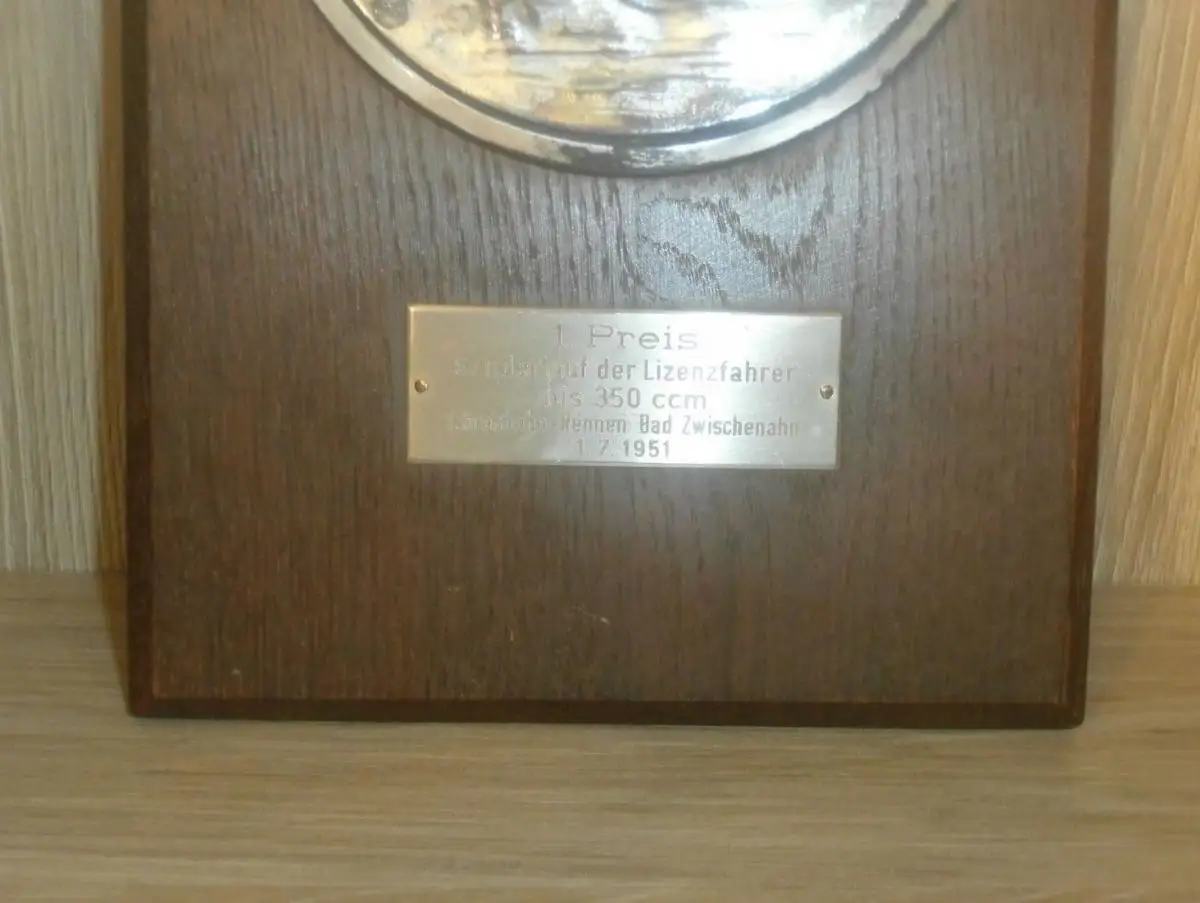 Tafel mit Plakette und Aufschrift " 1. Preis - Sonderlauf der Lizenzfahrer bis 350ccm - 1. Grasbahnrennen Bad Zwischenahn 1.7.1951 "