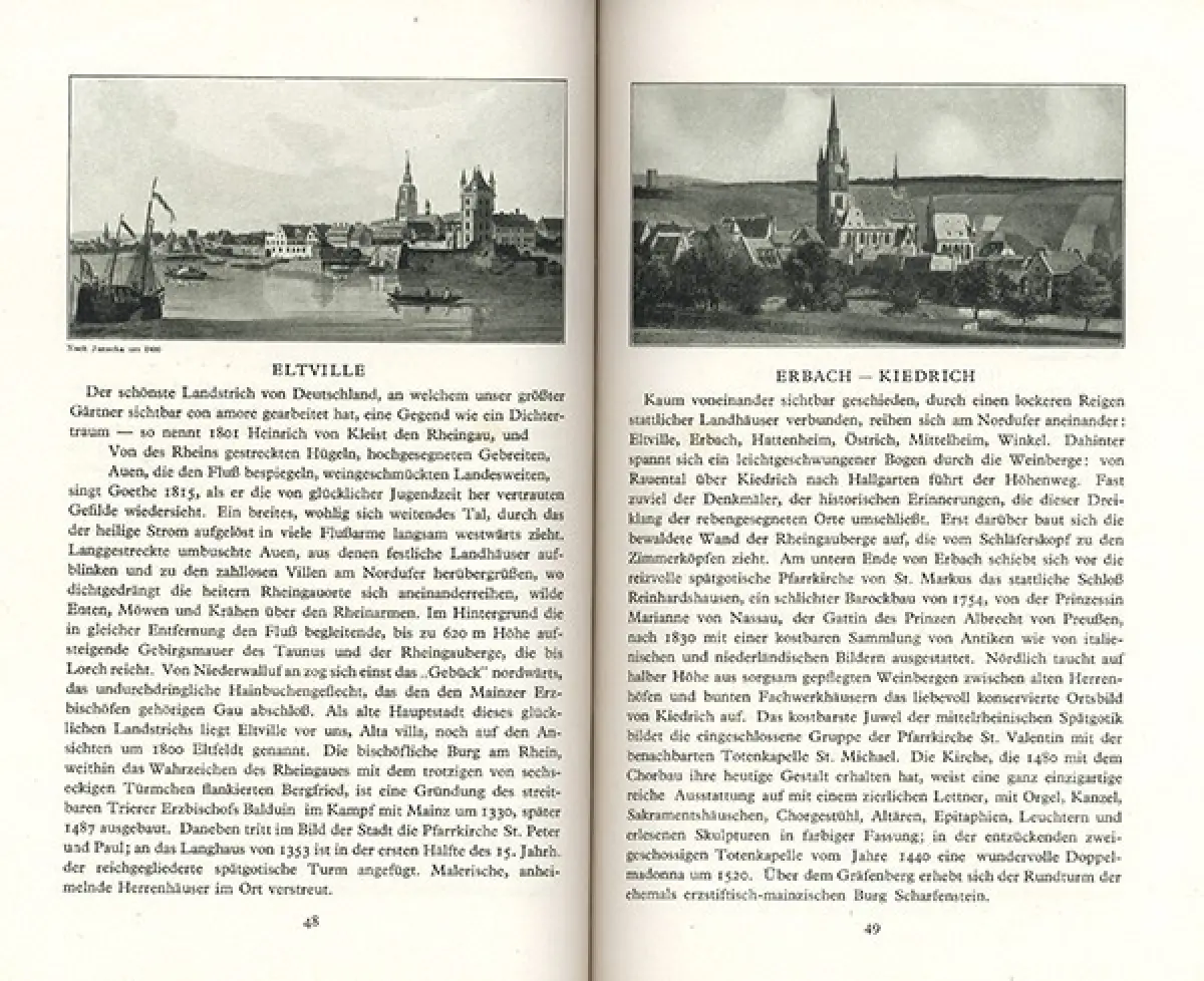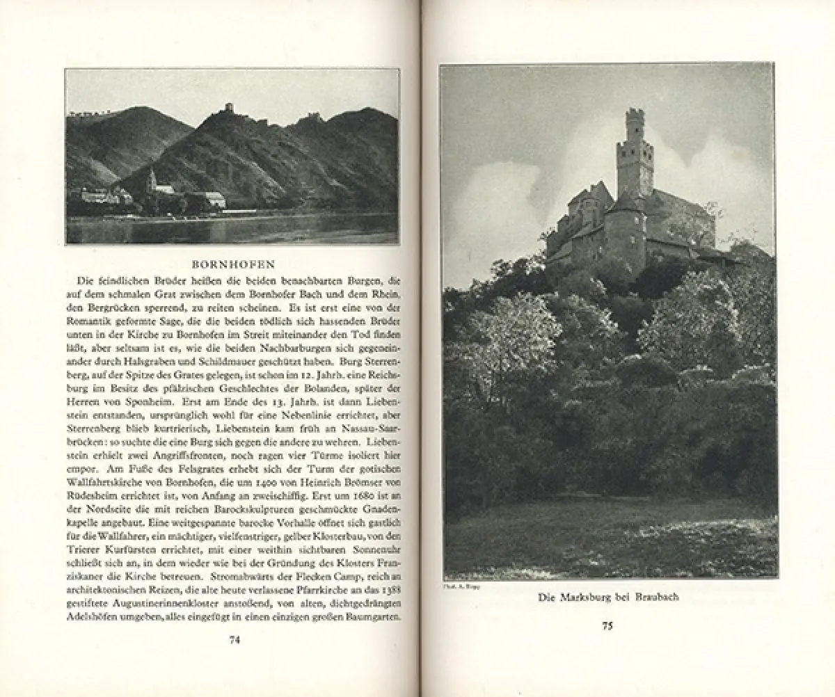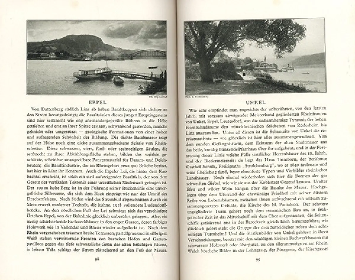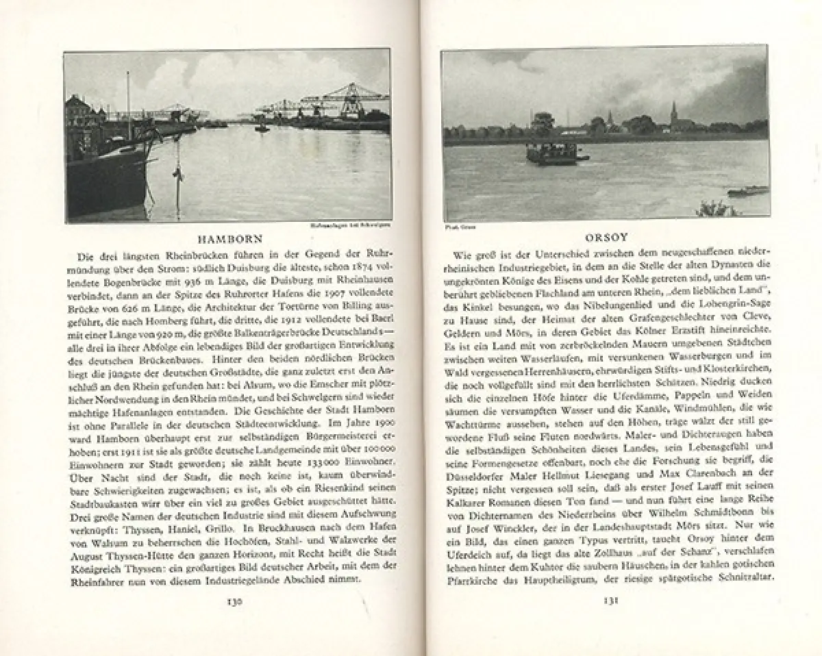 mit Gesamt 140 Seiten mit photographischen und druckgraphischen Abbildungen einer Karte einem Ortsregister mit ausführlicher Darstellung der Landschaften Städte und Orte entlang des Rheinstromes ihrer Geschichte Bauwerke Burgen und Sehenswürdigkeiten Eigenheiten des Landes von Mannheim bis Emmerich
