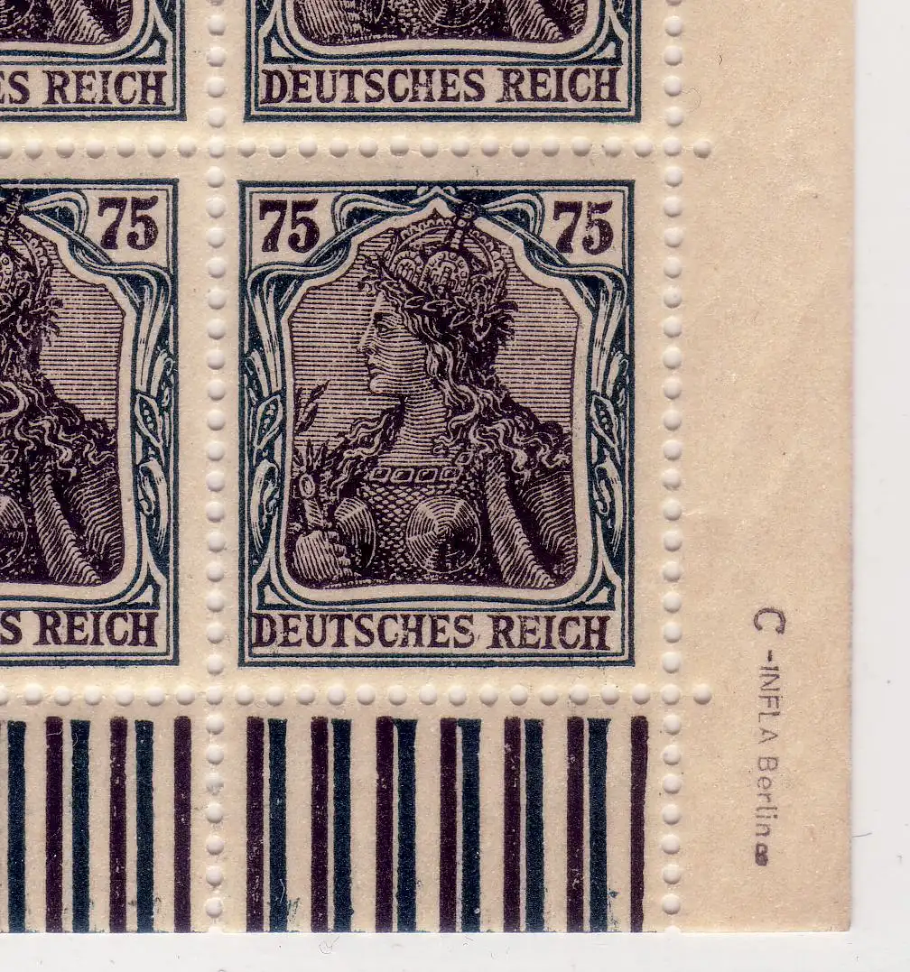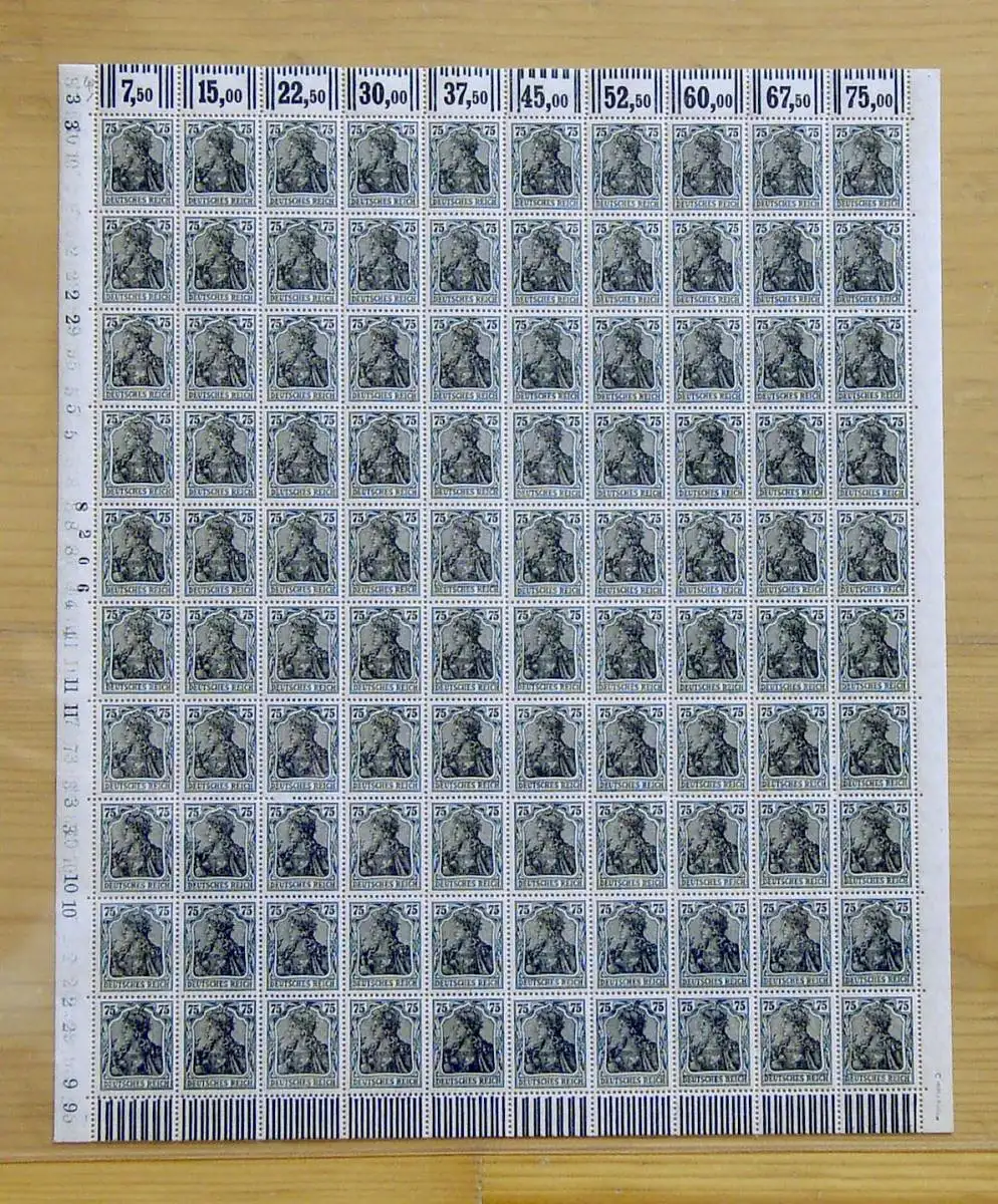 104c Germania 75 Pf Farbe c - kompl. Schalterbogen, ** postfrisch geprüft Infla