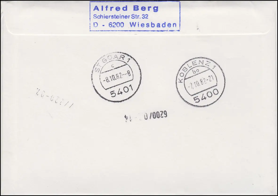 Enveloppe de bijoux pour l'essai Terminaux de guichet de la Deutsche Bundespost à partir du 7 octobre à Wiesbaden! - Lettre express sur Coblence avec le cachet d'arrivée ST. GOAR 1 - 8.10.82 Numéro de catalogue: 1.1 Examen: original Numéro d 'article: 00000000033842