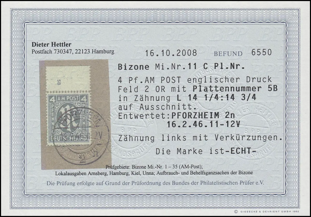 11 C Pl.Nr. 4 Pf. mit Plattennummer 5B auf Briefstück, Befund Hettler BPP