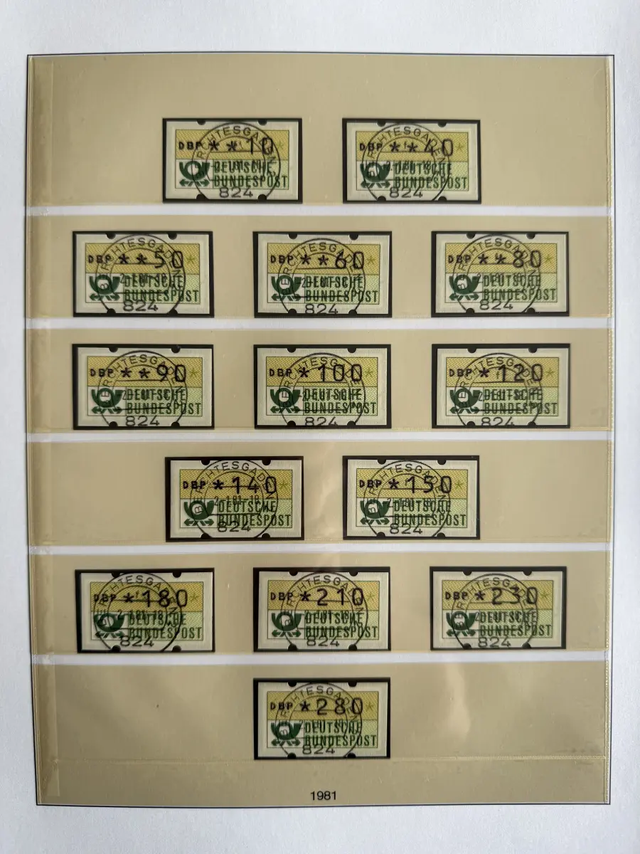 Von allen 14 Versuchspostämtern jeweils ein kompletter Satz (14 Werte 10 - 280 Pf.) auf Lindner-Vordruckblättern - alle Marken mit zentrischen Tagesstempeln 2.1.1981. Also insgesamt 196 Marken! Tolle, komplette Kollektion!