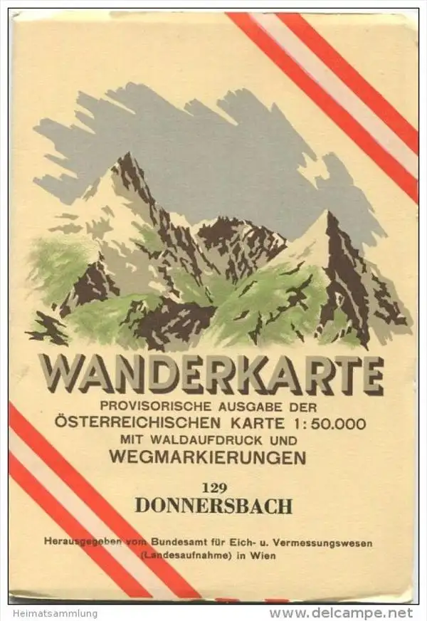 129 Donnersbach 1955 - Wanderkarte mit Umschlag - Provisorische Ausgabe der Österreichischen Karte 1:50.000 - Herausgegeben vom Bundesamt für Eich- u. Vermessungswesen (Landesaufnahme) in Wien - Einzelne Nachträge 1954 - Kartengrösse 66cm x 45cm - gefaltet 17cm x 12cm - Wegmarkierungen und Waldaufdruck - guter Zustand