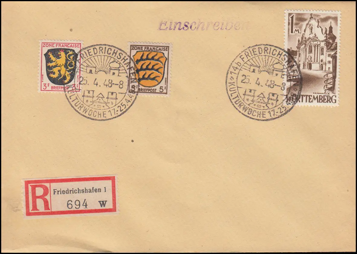 13 plis de blasphèmes 3 et 5 lettre Pf Blanko-R SSt FRIEDRICHSHAFEN 25.4.1948