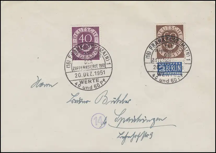 133 / 135 Posthorn 40 Pf und 60 Pf auf echt gelaufenem FDC mit ESST 20.12.1951