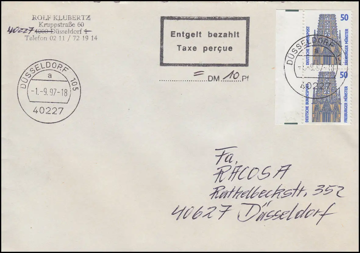 1340 C/D Swk de MH 31 avec salaire-payé Temple MiF Lettre DÜSSELDORF 1.9.1997