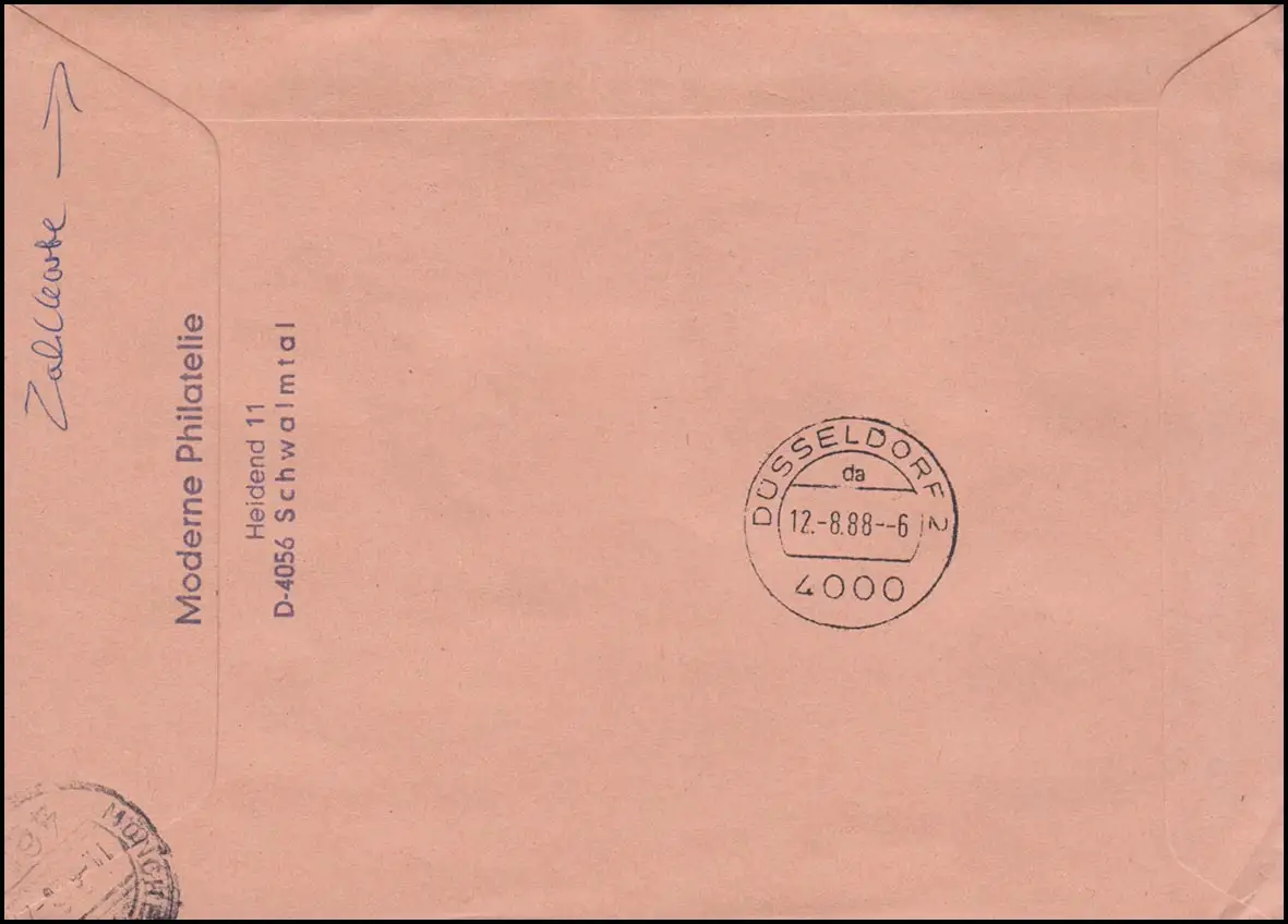 FDC d'inscription avec copie par envoi express / Express vers Düsseldorf Tampon d ' arrivée DÜSSELDORF 2 - 12.8.88 Numéro de catalogue: 1381 Examen: original Référence produit: 00000000014773>p>Remarque: Cet article n'est disponible qu'une seule fois. Vous recevrez exactement l'article représenté.