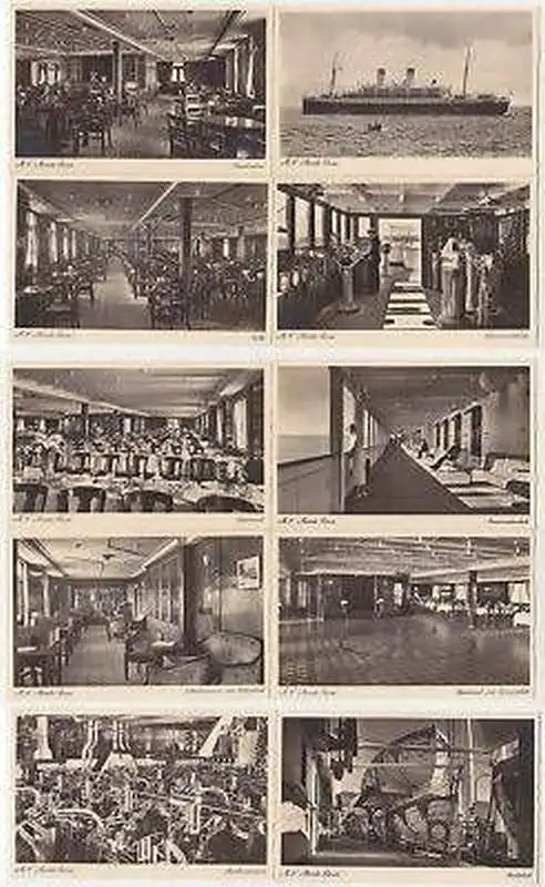 Aussenansicht, Maschinenraum, Bootsdeck, Speisesaal, Schreibzimmer, Bibliothek, Promenadendeck, Tanzparkett, Halle, Rauchsalon, Kommandobrücke, ungelaufen, gute Erhaltung siehe Bild,