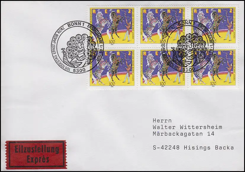 1600 cirque Renz, bloc de 6 avec PLF Feld 3, MeF Eil-FDC Essent Bonn 12.3.1990