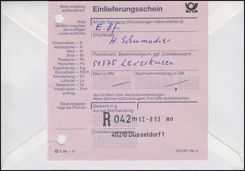 1663 Rhénanie-du-Nord-Westphalie, MiF Not-R-Zettel 40210 Düsseldorf R-FDC ESSt 12.8.1993