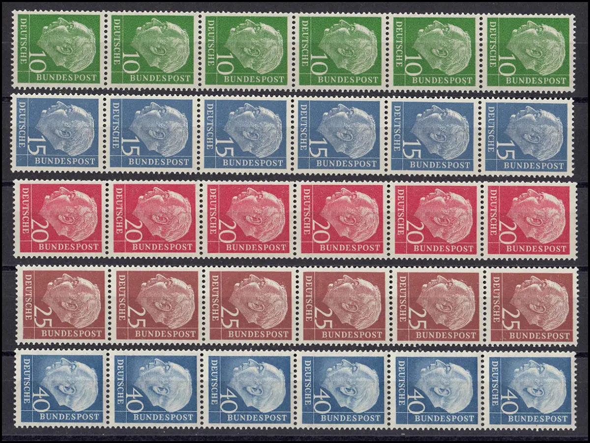 183-260y Heuss lumogen Satz 5 Werte im 6er-Streifen mit 2 Zählnr. komplett, **