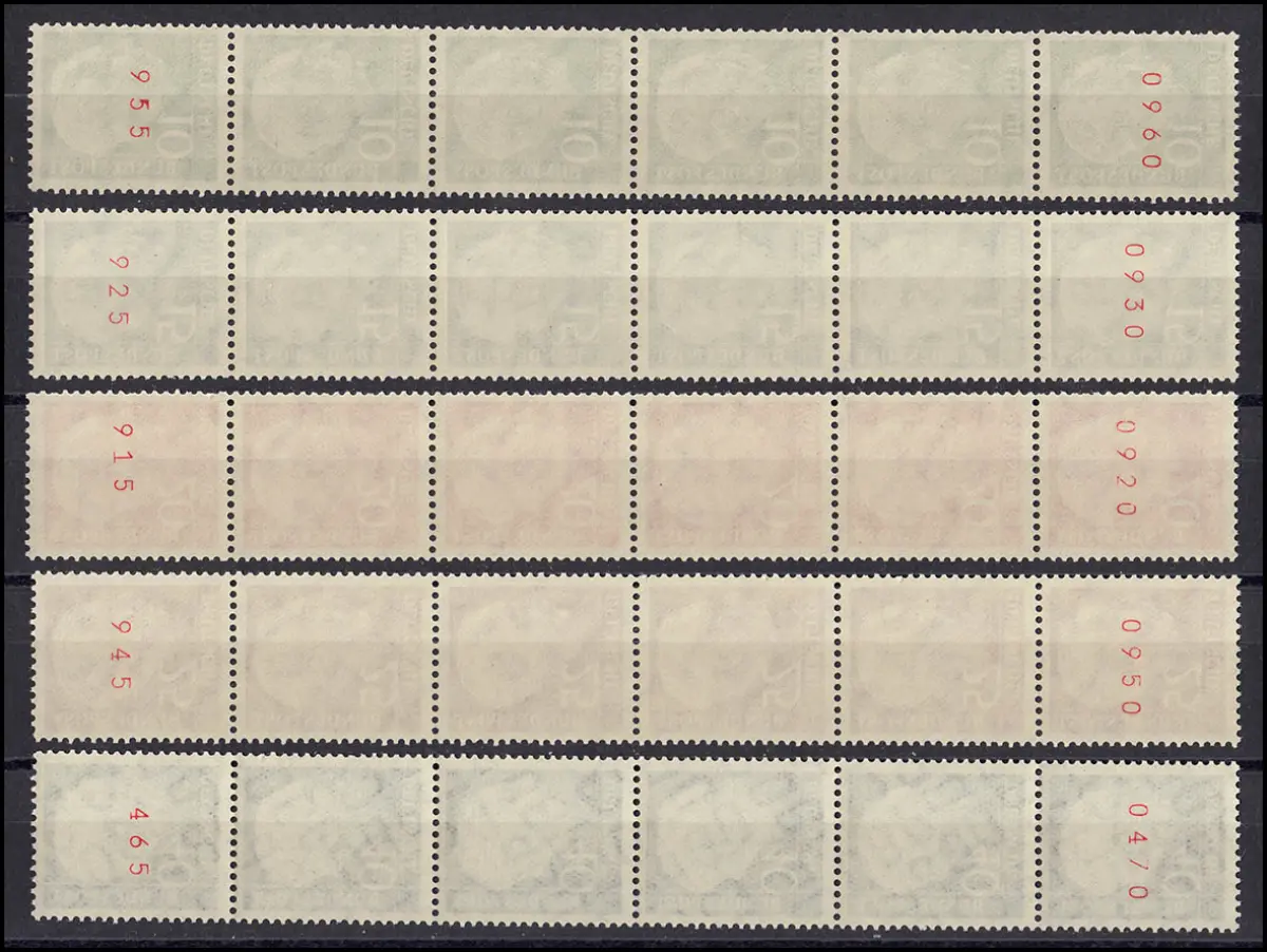 jeweils mit ROTER gerader UND ungerader Zählnummer auf den untersten und obersten Marken, ungefaltet, einwandfrei postfrisch. Die anderen Wertstufen gibt es fluoreszierend nicht als Rollenmarke.