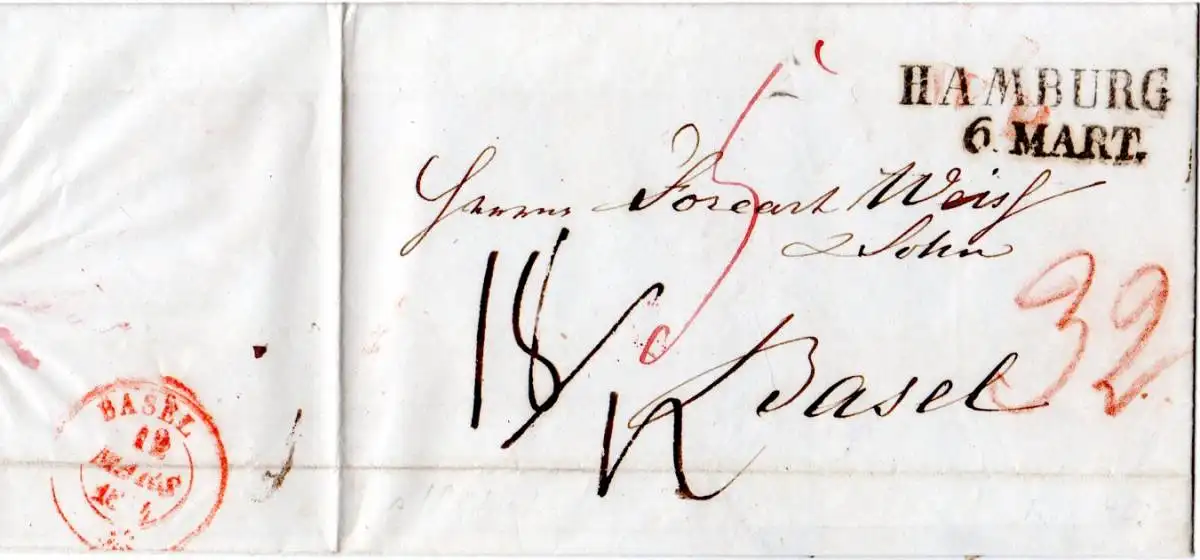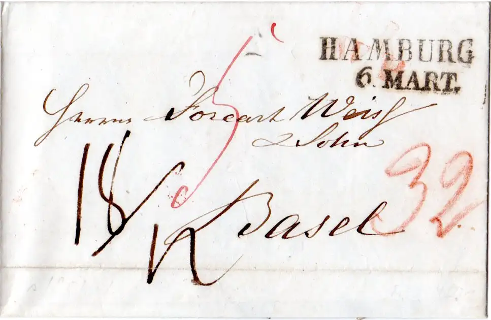 1844, L2 HAMBURG auf Portobrief n. Basel, Schweiz.