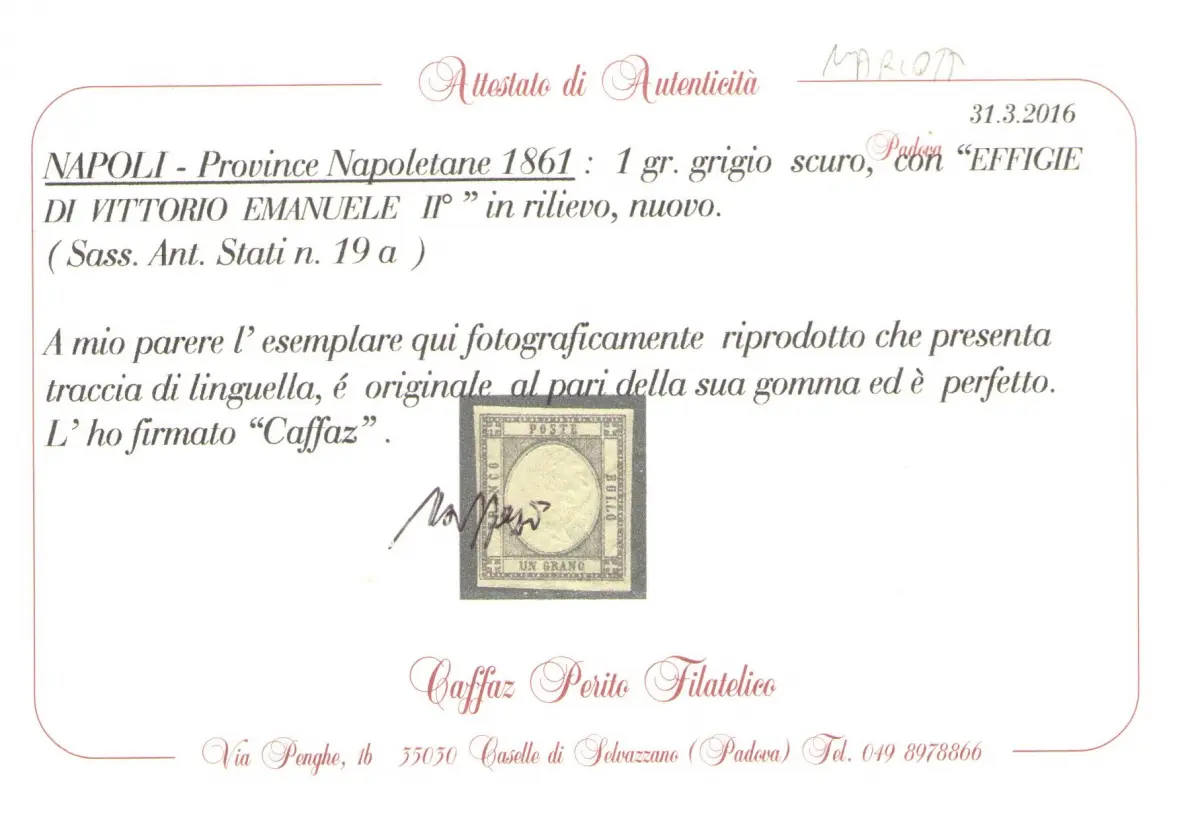 1861 NEAPEL - Neapolitanische Provinzen, N 19a, 1 dunkelgraue Körnung, MLH * - Original Caffaz Gummi Zertifikat - mit Spur von Linguella - Hinged Lot Claudio Sächsischer Katalog Nr. 19a Euro 750 - ROTE BOX AUSSEN