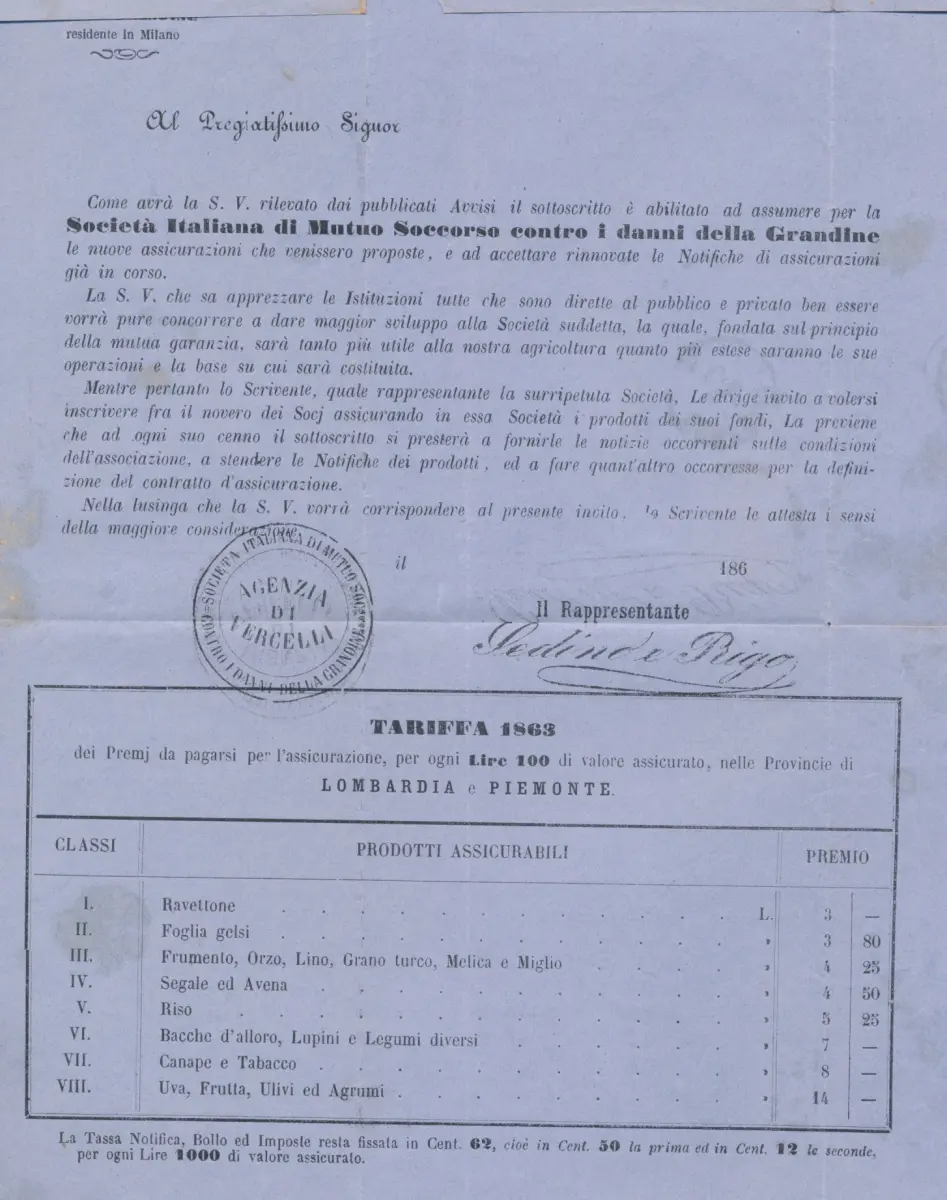 Italienische Gesellschaft zur gegenseitigen Hilfe gegen Hagelschäden, es handelt sich um die 1863 im Piemont und in der Lombardei geltenden Tarife, den zu zahlenden Preis pro 100 versicherte Lire - Sehr interessanter sächsischer Katalog - 400+++ Lot A/4