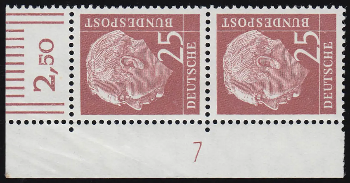 186xw Heuss 25 Pf Eck-Paar mit Druckerzeichen DZ 7 positiv, ungefaltet bügig, **