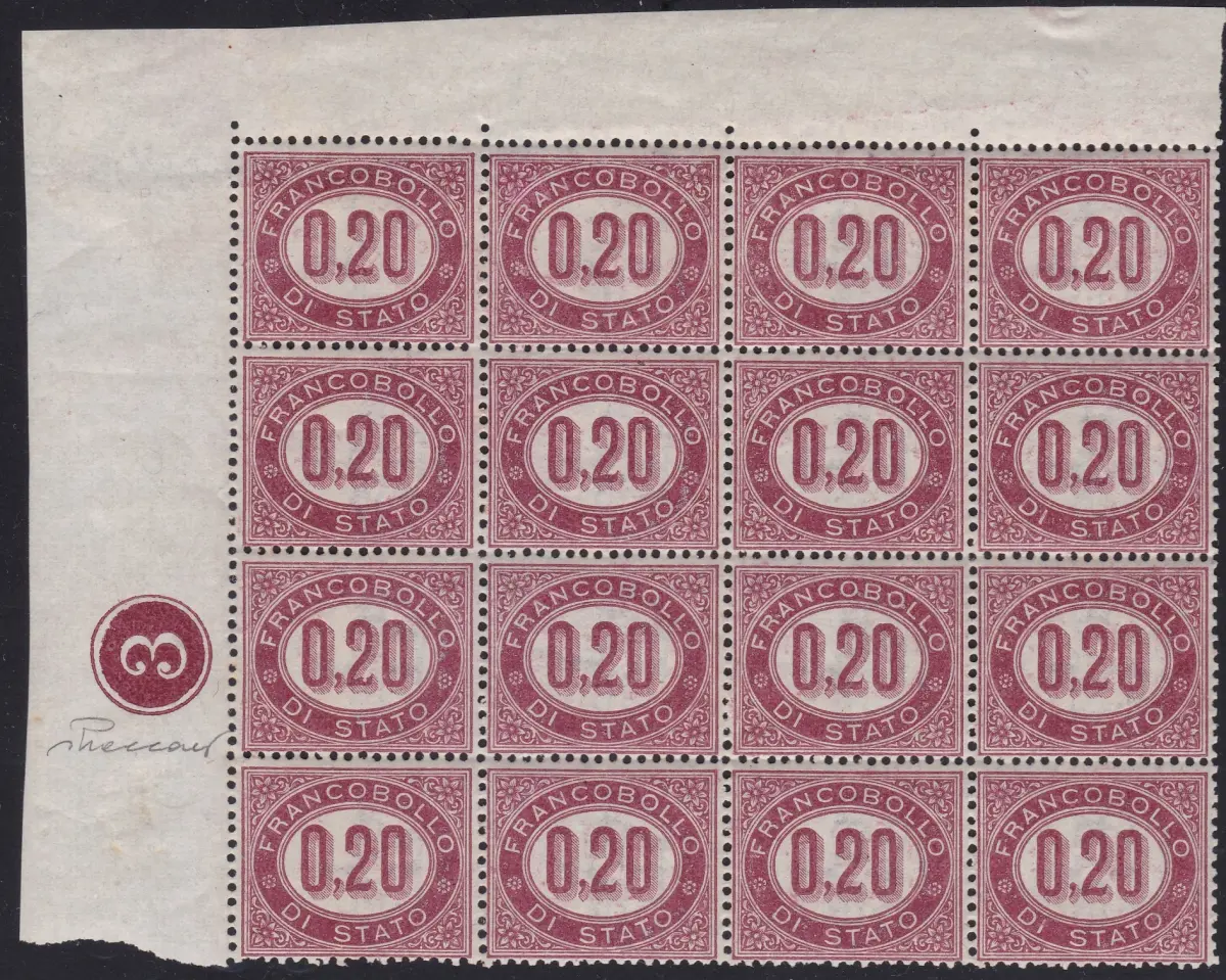 1875 Italien - Königreich, Dienst Nr. 3 MNH/** TISCHNUMMER 3 IM KREIS Wertziffer in einem Oval, Block mit 16 sächsischen Bogenrand Euro 375 Lot 83