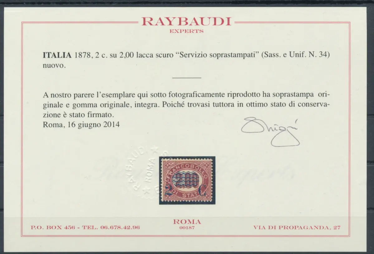 1878 Italien - Königreich, Nr. 34 - 2 Cent. auf 2,00 dunklem Lack, Service überdruckt, postfrisch** - Raybaudi Zertifikat Dienstmarken von 1875 mit blauem Aufdruck Sächsischer Katalog Euro 2.250 - weißer Karton Haus - Zentrierung auch mehr als dezent