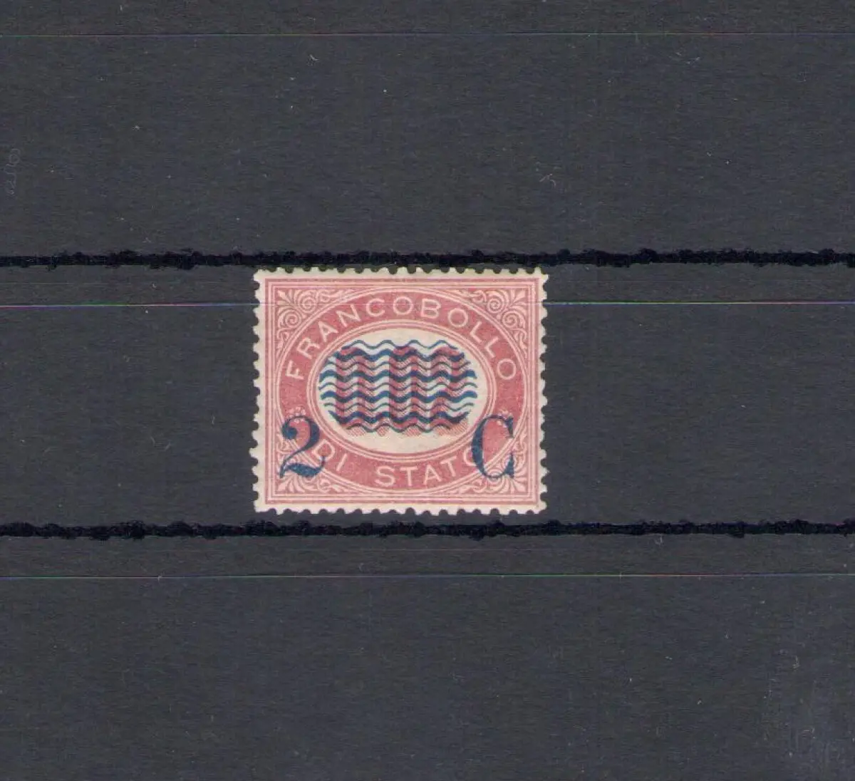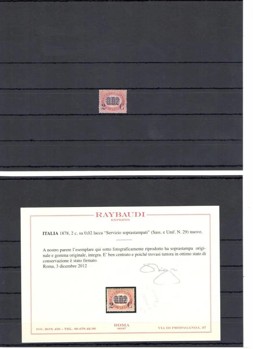 1878 Königreich Italien, 2 Cent auf 0,02 Lack, Nr. 29, 'Service Überdrucke', MNH ** - Raybaudi-Zertifikat mit der Aufschrift 'Es' gut zentriert' Vollgummi und Original - ohne Linguella - Not Hinged Lot Claudio Sächsischer Katalog Nr. 29 Euro 1750 (diskrete Zentrierung) - ROTE BOX AUSSEN
