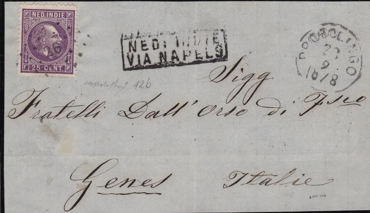 1878 NIEDERLÄNDISCH-INDIEN Titelblatt frankiert mit Nr. 12b 25c. violett signiert Bolaffi SELTEN AA / rotes Album Lot 2