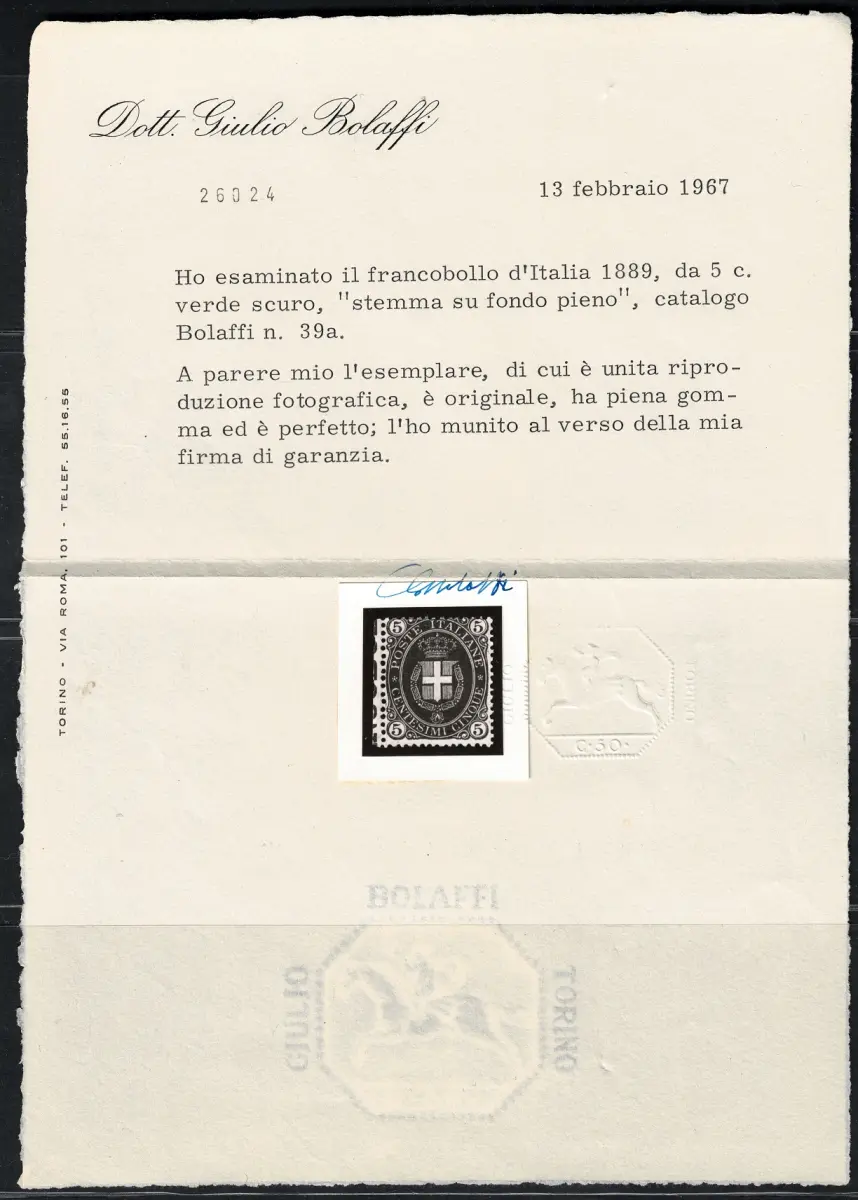 1889 Italien - Königreich, 5 Cent dunkelgrün Nr. 44 - postfrisch ** Sächsischer Katalog Euro 3.000 - Lot M Holzkiste