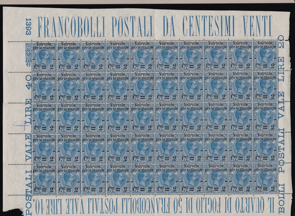 1890 ITALIEN - KÖNIGREICH, Nr. 51 2c. su 20c. hellblau MNH ** BLATT MIT 50 Postpaketen von 1884 überdruckt, 50er Bogen mit 25 Exemplaren mit sehr guter Zentrierung Sächsischer Katalog Euro 3.750 Lot 83
