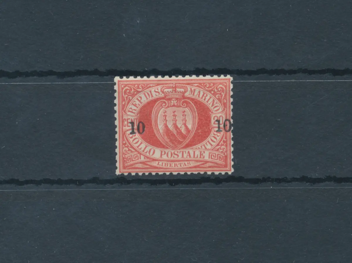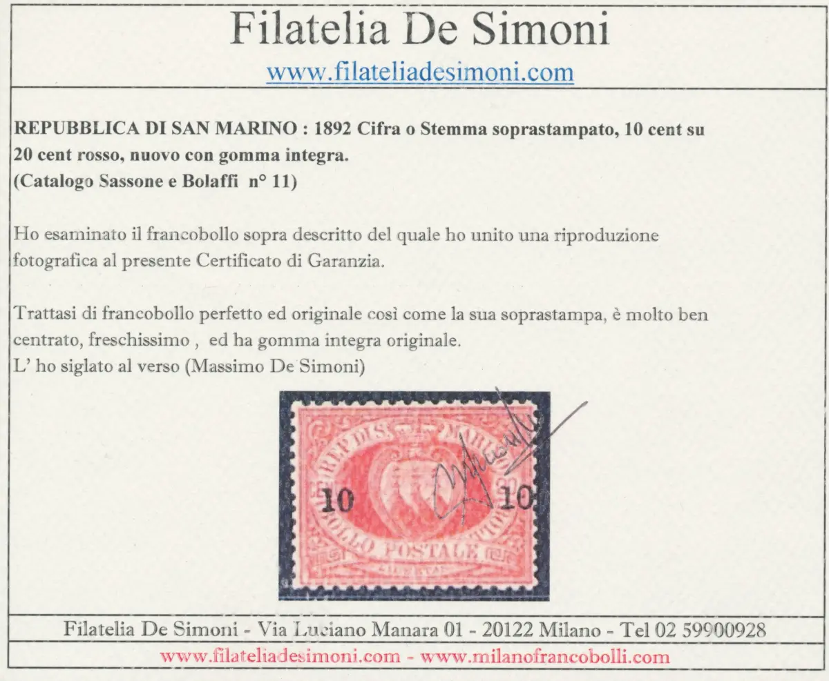 1892 SAN MARINO, Nr. 10, 10 Cent auf 20 Cent rot - Garantiezertifikat Philatelie De Simoni - MNH** - Optimal zentrierter Sächsischer Katalog, Euro 3250 für optimal zentrierte schwarze RSM Box