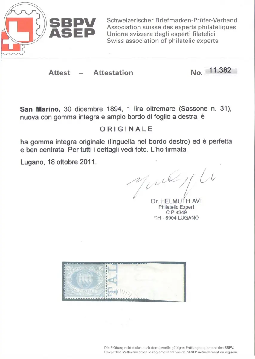 1894 San Marino, Sächsischer Katalog Nr. 31 - 1 Lira Übersee rechter Bogenrand - postfrisch** - Helmut Havi Zertifikat - Diskrete sächsische Zentrierung Nr. 31 Euro 5.500 - rote Box rsm