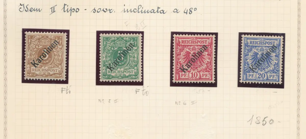 1899 - 1900 Caroline - Yvert n. 1/4 - Karolinen Aufdruck schräg zu 48 - II Typ - MLH* - postfrisch mit Originalgummi und Linguella-Spuren. Signierte Briefmarken Oliva Yvert Nr. 1/4 Euro 1800 - A/Lotto 18