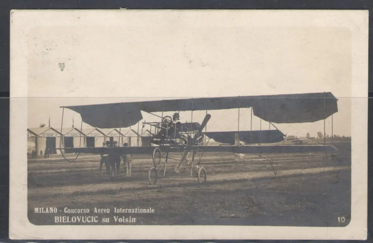 1910 Italien - Mailand Circuito Aereo Internazionale - Postkarte - Gebrauchte Postkarte mit nicht sehr scharfer Annullierung wie im Katalog Mailand Campo d'Aviazione - Signatur Giorgio Colla im erweiterten Sinne und Alberto Diena im erweiterten Sinne - SELTENES braunes Album Lot M