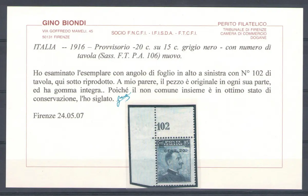 1916 Italien Königreich Michetti aufgedruckt 20 Cent auf 15 Cent grau schwarz Nr. 106 Ungewöhnliche Tafelnummer, neuer Vollgummi und Original, Zertifikat Blond Sächsischer Katalog Euro Lot 83 Album 1