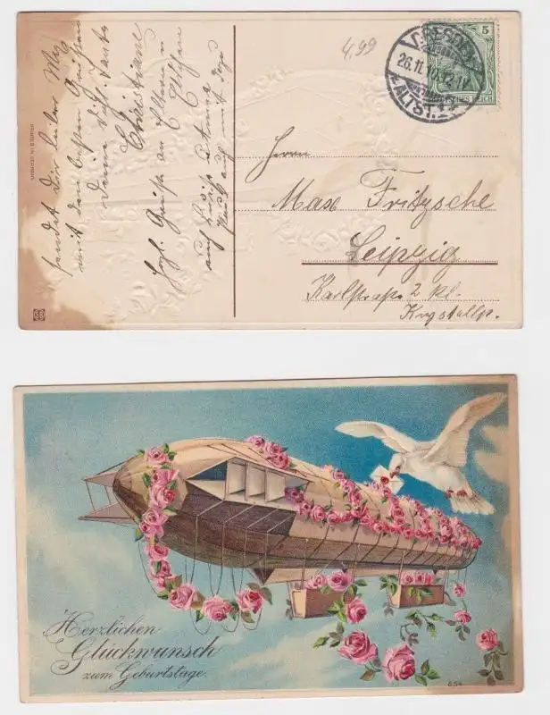 19189 Glückwunsch zum Geburtstag Ak geschmückter Zeppelin und Brieftaube 1910