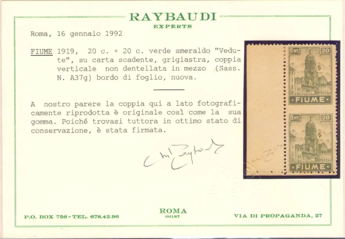 1919 Fluss - Ungezahnte Ansichten in der Mitte, Paar, Nr. A37g - MH* - Neuer Originalgummi mit Linguella-Spur, signiert Raybaudi Sächsischer Katalog Nr. A37g Euro 600 - Raybaudi Zertifikat - Lot Kolonien Album Rot