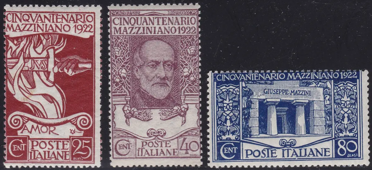 1922 Italia, Nr. 128/130 Mazzini, Serie mit 3 Werten, postfrisch ** 50. Todestag von Giuseppe Mazzini Sächsischer Katalog Euro 150 Lot 81
