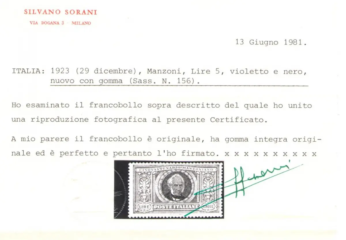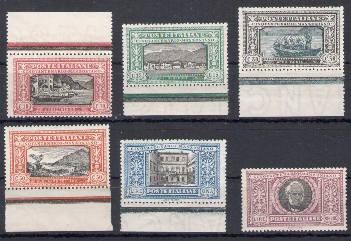 1923 Italien - Königreich - Nr. 151-56 - Komplette Serie 6 Werte - 50. Todestag von Alessandro Manzoni - MNH ** - Vollgummi und Original, einschließlich des Zertifikats von Silvano Sorani Sächsischer Katalog - Euro 3500 Zentrierung Gut / Hervorragend für 5 Lire und gut zentriert die Serie Album bordeaux