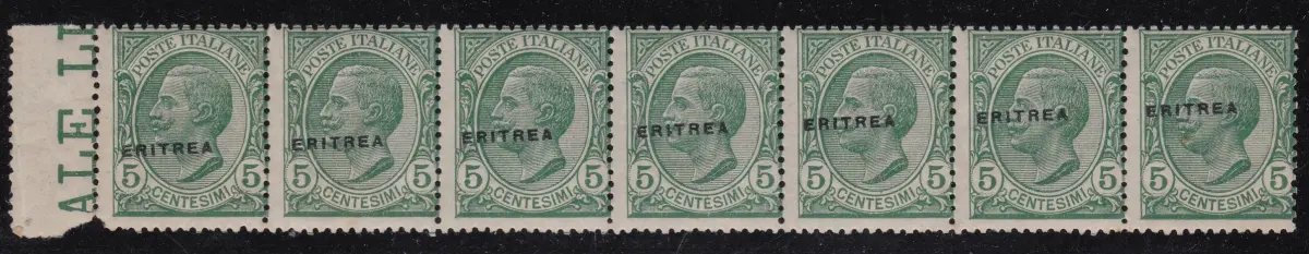 1924 ERITREA, Nr. 79f 5c. grüner 7er-Streifen postfrisch / ** Sächsischer Katalog Euro 945 ++ A / beige Album Lot 15