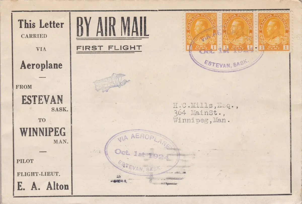1924 KANADA - FIRST FLIGHT Estevan-Winnipeg vom 1. Oktober 1924 auf vorbereitetem Brief mit Sonderstempel Müller 26. EA Alton Lotto 108 Pilot