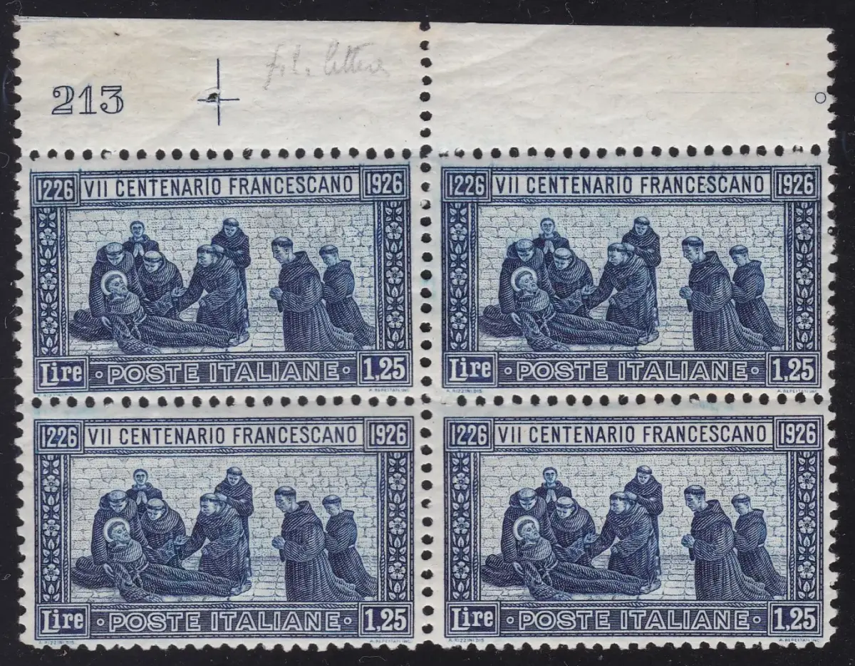 1926 Italien - Königreich, Nr. 199 MNH / ** 4er Block mit Tafelnummer 213 7. Todestag des heiligen Franziskus, gez. 11 FILIGRAN BUCHSTABEN Lot 83