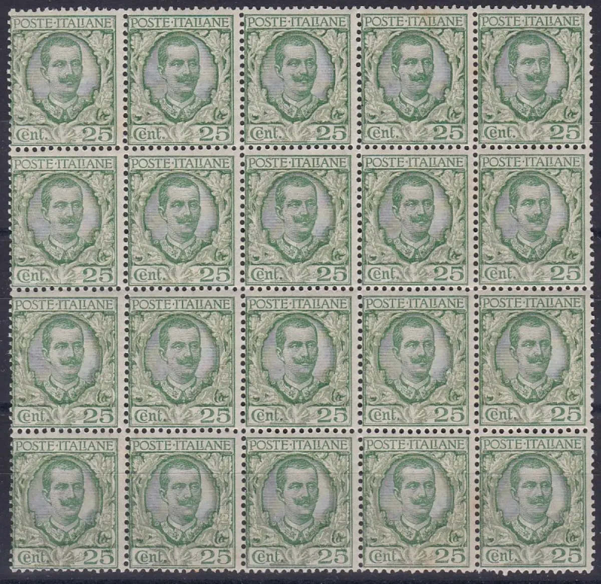 1926 Italien - Königreich - Nr. 200 Block von 20 MNH / ** modifizierter floraler Typ, 25c. grün und olivgrün Sächsischer Katalog Euro 100 VOLLGUMMI MAX
