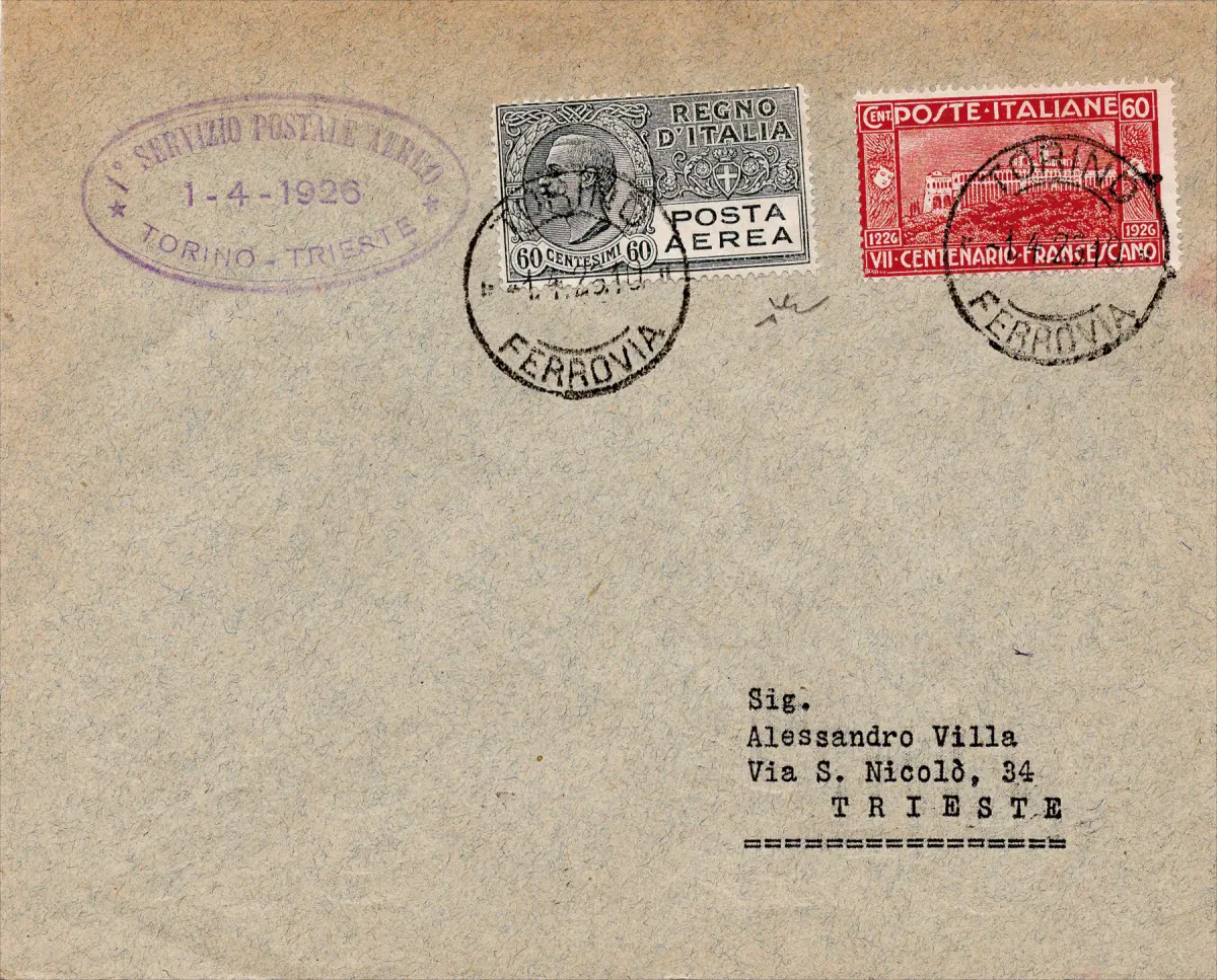 Umschlag - 1926 Turin/Triest vom 1. April - Aerogramm des ersten SISA-Fluges mit handlicher + mechanischer Ankunftsstornierung (Kat.Sass. Nr. 56, Longhi Nr. 1437) - Selten mit doppelter Ankunftsstornierung - Kat. euro 275 Cod. 64/17