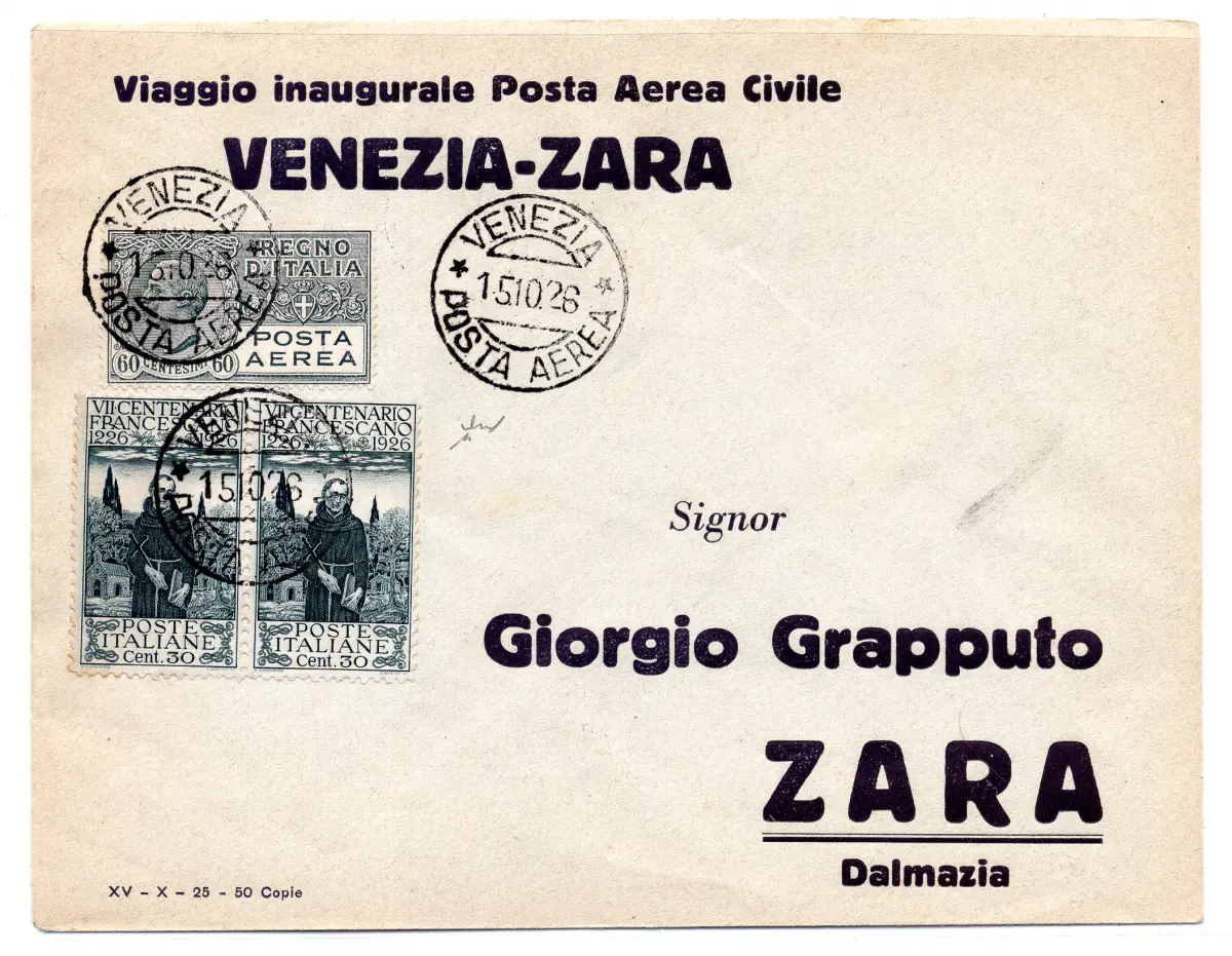 Umschlag - 1926 Venedig/Zara vom 15.10.26 - Aerogramm mit SISA-Eröffnungsflug - (Kat.Sass. n. 73a, Longhi Nr. 1605) - Ungewöhnlich, einige Dutzend Aerogramme transportiert Cod. 81/17