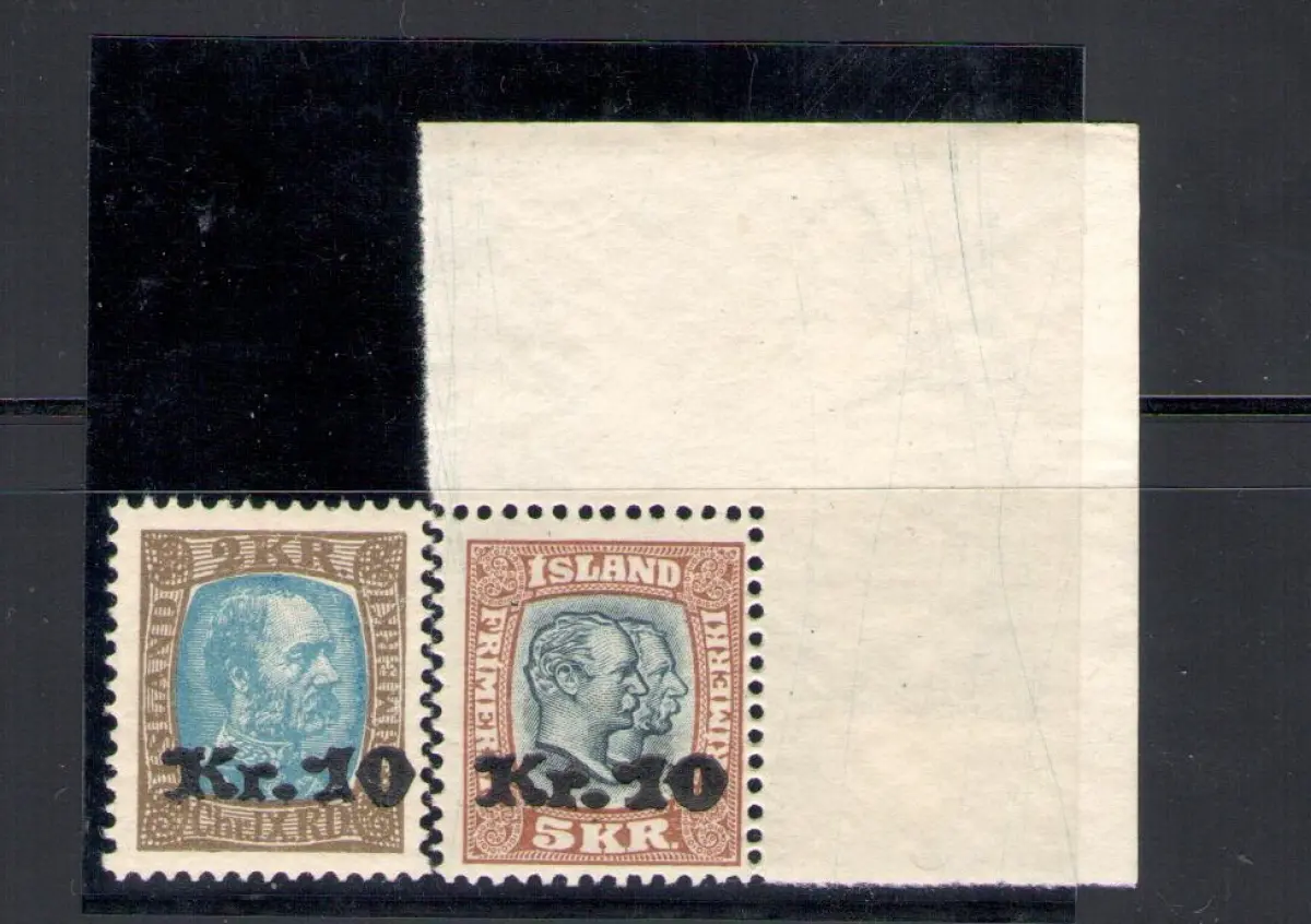 1929-30 ISLAND, Briefmarken Nr. 45 und 61 Neuwert überdruckt, 2 Werte Nr. 121/122 MNH ** Raybaudi Zertifikat, Vollgummi und Original, hoher Wert Bogenwinkel RAR Einheitskatalog Euro 1220 A Los 24