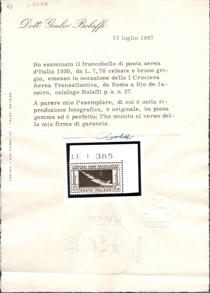 1930 Königreich Italien, Transatlantikkreuzfahrt von General Balbo, 7,70 hellhimmlische Nr. 25 - Bolaffi-Zertifikat - MNH **,, neu und perfekt, Vollgummi und original, erweiterte Unterschrift Giulio Bolaffi und Unterschrift Alberto Diena, Zertifikat Giulio Bolaffi.